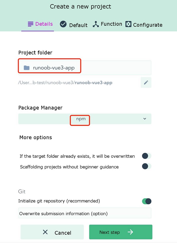 In the previous chapter of Vue3 installation, we used the Vue The syntax format for creating a project with the Vue Create a file created by the The options option can be: Next, we create Executing the above command will bring up the installation options interface: Press the enter key to enter the installation and wait for a moment to complete the installation. After the installation is complete, we enter the project directory: cd runoob-vue3-app2 Launch application: Then open http://localhost:8080/ , and you can see the application interface: In addition to using the Vue Run the command: Execute the above command and a project management interface pops up in the browser: We can click the “create” option to create a project, select “create Project here” at the bottom, and select a path at the top of the page: Then enter our project name, select the package management tool as You can choose the configuration by default: Then wait for the installation to be completed, and the administrative interface for the installation is as follows: init command to create a project. In this chapter, we mainly introduce the Vue create command to create a project and the use of the Vue ui command to open a graphical installation interface. 2.4.1. Vue