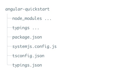 In Next, we use the After a successful execution angular-quickstart create the following files in the following code: package.json file: ¶ { "name": "angular-quickstart", "version": "1.0.0", "scripts": { "start": "tsc && concurrently \"npm run tsc:w\" \"npm run lite\" ", "lite": "lite-server", "postinstall": "typings install", "tsc": "tsc", "tsc:w": "tsc -w", "typings": "typings" }, "license": "ISC", "dependencies": { "@angular/common": "2.0.0", "@angular/compiler": "2.0.0", "@angular/core": "2.0.0", "@angular/forms": "2.0.0", "@angular/http": "2.0.0", "@angular/platform-browser": "2.0.0", "@angular/platform-browser-dynamic": "2.0.0", "@angular/router": "3.0.0", "@angular/upgrade": "2.0.0", "core-js": "^2.4.1", "reflect-metadata": "^0.1.3", "rxjs": "5.0.0-beta.12", "systemjs": "0.19.27", "zone.js": "^0.6.23", "angular2-in-memory-web-api": "0.0.20", "bootstrap": "^3.3.6" }, "devDependencies": { "concurrently": "^2.2.0", "lite-server": "^2.2.2", "typescript": "^2.3.4", "typings":"^1.3.2" } }