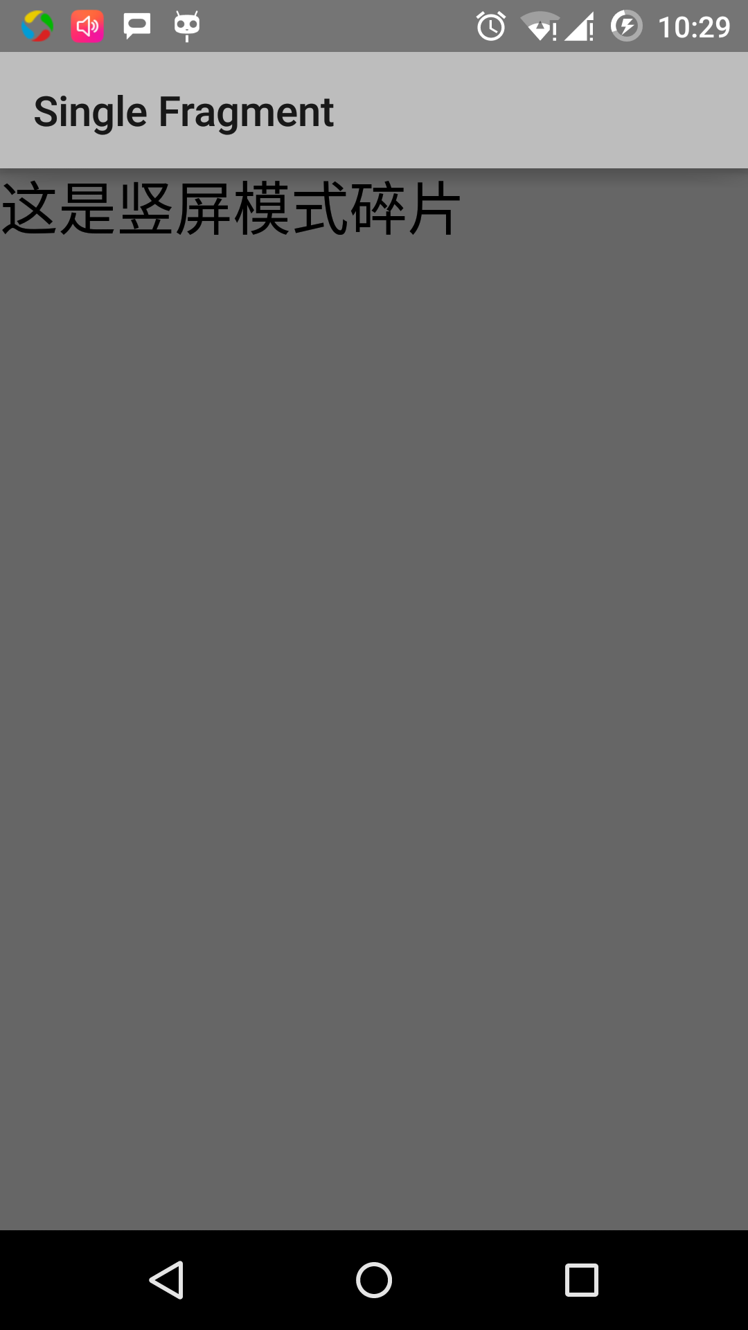 PortraitFragment.java 文件的内容:package cn.uprogrammer.singlefragment; import android.app.Fragment; import android.os.Bundle; import android.view.LayoutInflater; import android.view.View; import android.view.ViewGroup; public class PortraitFragment extends Fragment { @Override public View onCreateView(LayoutInflater inflater, ViewGroup container, Bundle savedInstanceState) { /** * Inflate the layout for this fragment */ return inflater.inflate( R.layout.portrait_fragment, container, false); } }