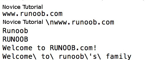 #/ Usr/bin/perl # Wrap n Within double quotes, valid $str="Rookie Tutorial nwwww. runoob. com"; Print "$str n"# Wrap \\N is within single quotes, invalid $str='Rookie Tutorial nwwww. runoob. com'; Print "$str n"# Only R will be converted to uppercase $str=" urunoob"; Print "$str n"# All letters will be converted to uppercase $str=" Urunoob"; Print "$str n"# The specified part will be converted to uppercase $str="Welcome to Urunoob E.com!"; Print "$str n"# Add a backslash $str=" QWelcome to runoob's" to non word characters up to E Family "; print" $str n "; The output of the above example is as follows: