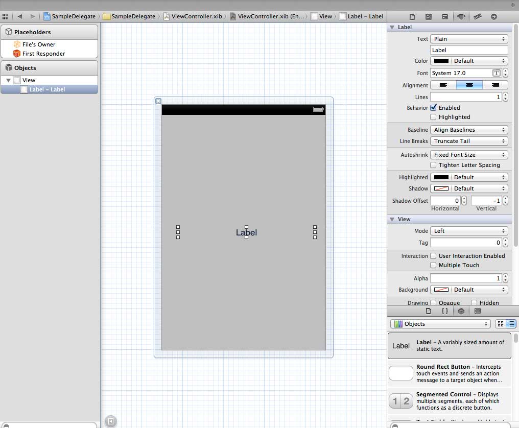 8. 将标签从对象库拖到UIView,从而在ViewController.xib中添加UILabel,如下所示: