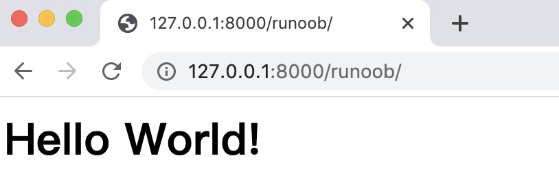 fromdjango.shortcutsimportrenderdefrunoob(request):context= {}context['hello']='Hello World!'returnrender(request,'runoob.html',context) HelloWorld/HelloWorld/urls.py file code: ¶