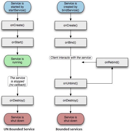 The service has a lifecycle approach that can monitor changes in the state of the service and perform work at the appropriate stage. The figure on the left below shows when the service passes through startService() The life cycle when it is created, and the figure on the right shows when the service passes through bindService() The life cycle when it is created: