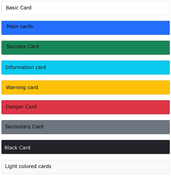 <div class="container"> <h2>Multiple color cardsh2> <div class="card"> <div class="card-body">Basic Carddiv> div> <br> <div class="card bg-primary text-white"> <div class="card-body">Main cardsdiv> div> <br> <div class="card bg-success text-white"> <div class="card-body">Success Carddiv> div> <br> <div class="card bg-info text-white"> <div class="card-body">Information carddiv> div> <br> <div class="card bg-warning text-white"> <div class="card-body">Warning carddiv> div> <br> <div class="card bg-danger text-white"> <div class="card-body">Danger Carddiv> div> <br> <div class="card bg-secondary text-white"> <div class="card-body">Secondary Carddiv> div> <br> <div class="card bg-dark text-white"> <div class="card-body">Black Carddiv> div> <br> <div class="card bg-light text-dark"> <div class="card-body">Light colored cardsdiv> div> div>