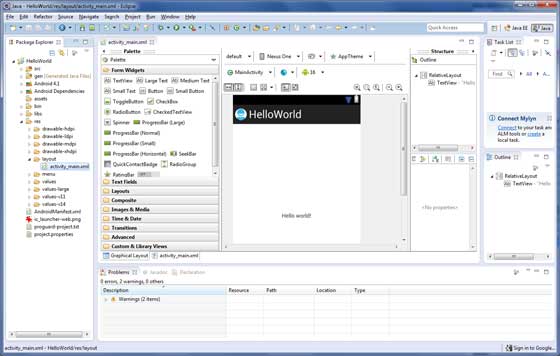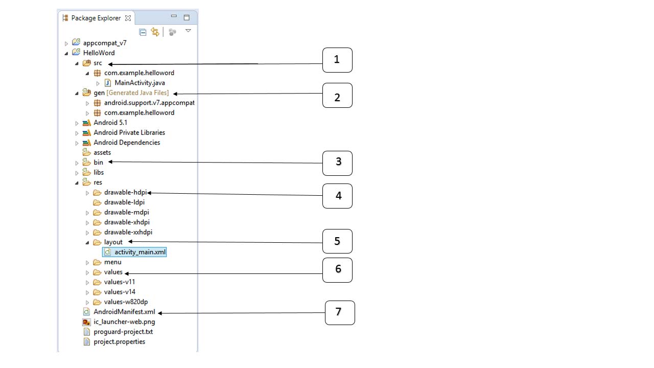 activity_main.xml It’s a person in res/layout Under the directory layout Files. Is referenced when the application builds its interface. You will modify this file very frequently to change the layout of the application. In the “Hello World” application, this file has a default layout, as follows: <RelativeLayout xmlns:android="http://schemas.android.com/apk/res/android" xmlns:tools="http://schemas.android.com/tools" android:layout_width="match_parent" android:layout_height="match_parent" > <TextView android:layout_width="wrap_content" android:layout_height="wrap_content" android:layout_centerHorizontal="true" android:layout_centerVertical="true" android:padding="@dimen/padding_medium" android:text="@string/hello_world" tools:context=".MainActivity" /> RelativeLayout>