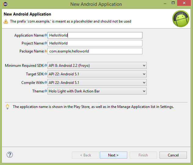 Now let’s start writing a simple Android application that prints out “Hello World”. The first step is to create a simple Android application through Eclipse IDE. Follow the option File-> New-> Project, and finally select Android New Application from the wizard list. Now name the application HelloWorld using the following window wizard: Next, follow the instructions provided to keep all default inputs until the last step. Once the project is created successfully, you will see the following project interface- Before running the application, you need to know some file directories and files in the Android project- Serial number Folders, files, and descriptions 1 Src: contains all the .java source files in the project. By default, it includes an active class corresponding to the MainActivity.java source file, which will be run when the application is launched with the application icon. 2 Gen: this contains .R files generated by the compiler, referencing all the resources in the project. The file cannot be modified. 3 bin:该文件夹包含Android由APT构建的.apk包文件,以及运行Android应用程序需要的其他所有东西。 4 Res/drawable-hdpi: this directory includes all the drawable objects needed for high-density screen design. 5 Res/layout: this directory holds the files defined for the user interface. 6 Res/values: this directory holds a wide range of XML files containing a range of resources, such as strings and color definitions. 7 AndroidManifest.xml:这是应用程序的清单文件,描述了应用程序的基础特性,定义了它的各种组件。 The following sections give an overview of some important application files. The main activity code is in Here, No matter what components you develop as part of your application, you need to use the 这里,…标签之间是应用程序相关的组件。 The label is used to specify an activity Intention filter Here are the tags that will be used in your manifest file to specify different Android application components: Active element Service element Broadcast receiver element Content provider element 这是一个简单的 Let’s try to run the Hello World we just created! Applications. Suppose you have already created the AVD when you set up the environment. Run the application from Eclipse, open an active file in your project, and click Congratulations on developing your first Android application. Follow the remaining tutorials step by step, and you will become a great Android developer. 3.8.1. Create an Android application ¶