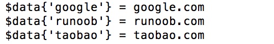 - instead of quotation marks:%data = (-google=>'google.com', -runoob=>'runoob.com', -taobao=>'taobao.com');